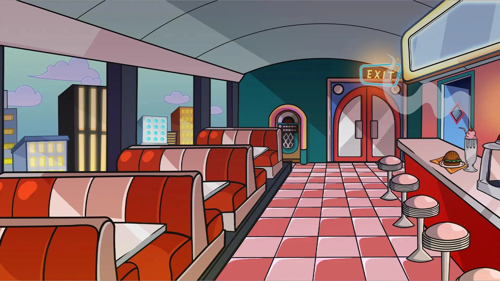 Inside, the retro-themed diner buzzed with late-night energy. The checkered floor gleamed under fluorescent lights, and the air was thick with the aroma of sizzling patties and golden fries. Max slid into a red vinyl booth and gazed at the menu where the Big Burger special promised to be "loaded up with xtra cheese" and came with a side of crispy onion rings.