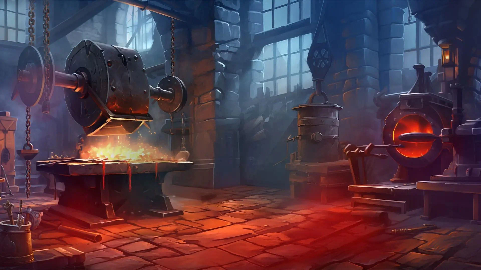 The smithy is filled with tools for crafting wondrous weapons, including bellows, anvils, and mighty hammers.