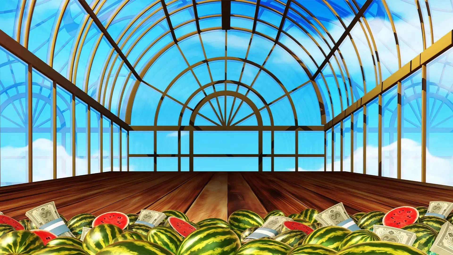 Adventurous visitors who paid admission to the greenhouse (usually around 100 coins) were sometimes rewarded with the spectacular Bonus Feature. If three special watermelons aligned under the greenhouse's central dome, the entire garden would transform. Regular fruits would vanish, replaced by golden coins bearing different values and magical melons that danced around collecting treasures.