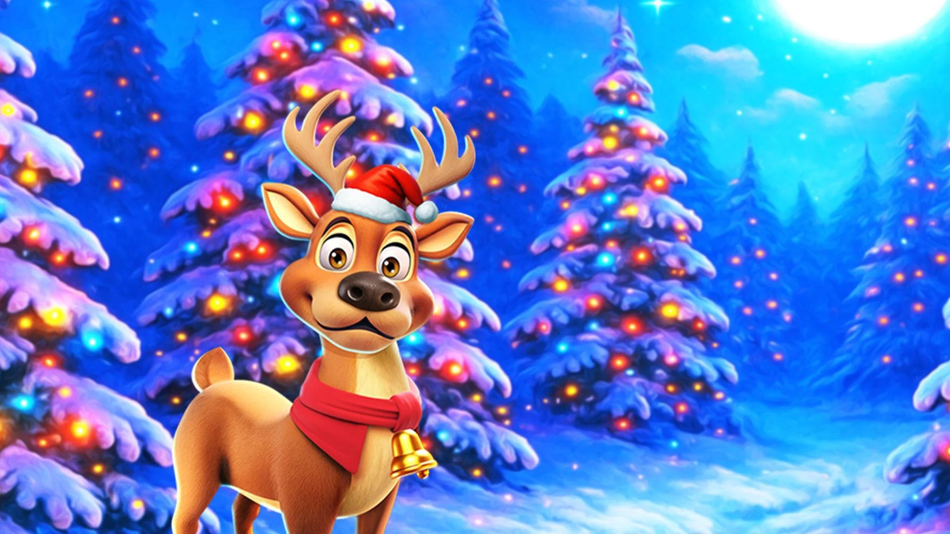 The winter night glowed with an enchanting blue radiance as snowflakes drifted lazily through the frosted air. Deep in the heart of the North Pole forest, where towering evergreens stood adorned with twinkling lights of every color, a young reindeer named Rusty prepared for the most important night of his life.