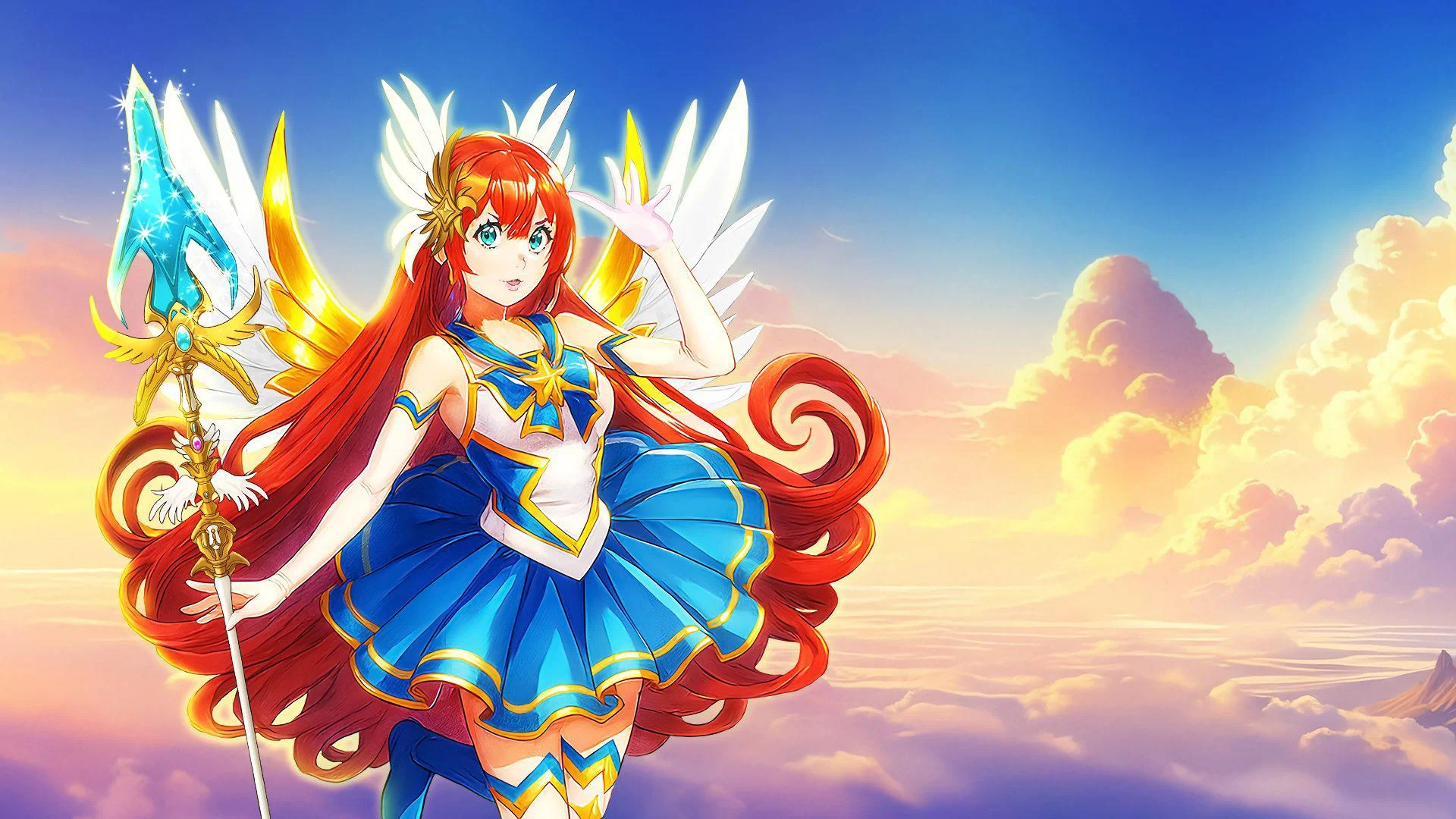 Princess Aria, the current guardian of Celestara, inherited her divine duty on the day she came of age. With flowing crimson hair that catches the light like burnished copper and magnificent golden wings that span wider than any mortal could imagine, she patrols the crystal skies wielding the legendary Scepter of Radiance. Her elegant armor, woven from condensed starlight itself, gleams in shades of crimson and azure, marking her as the chosen protector of the realm.