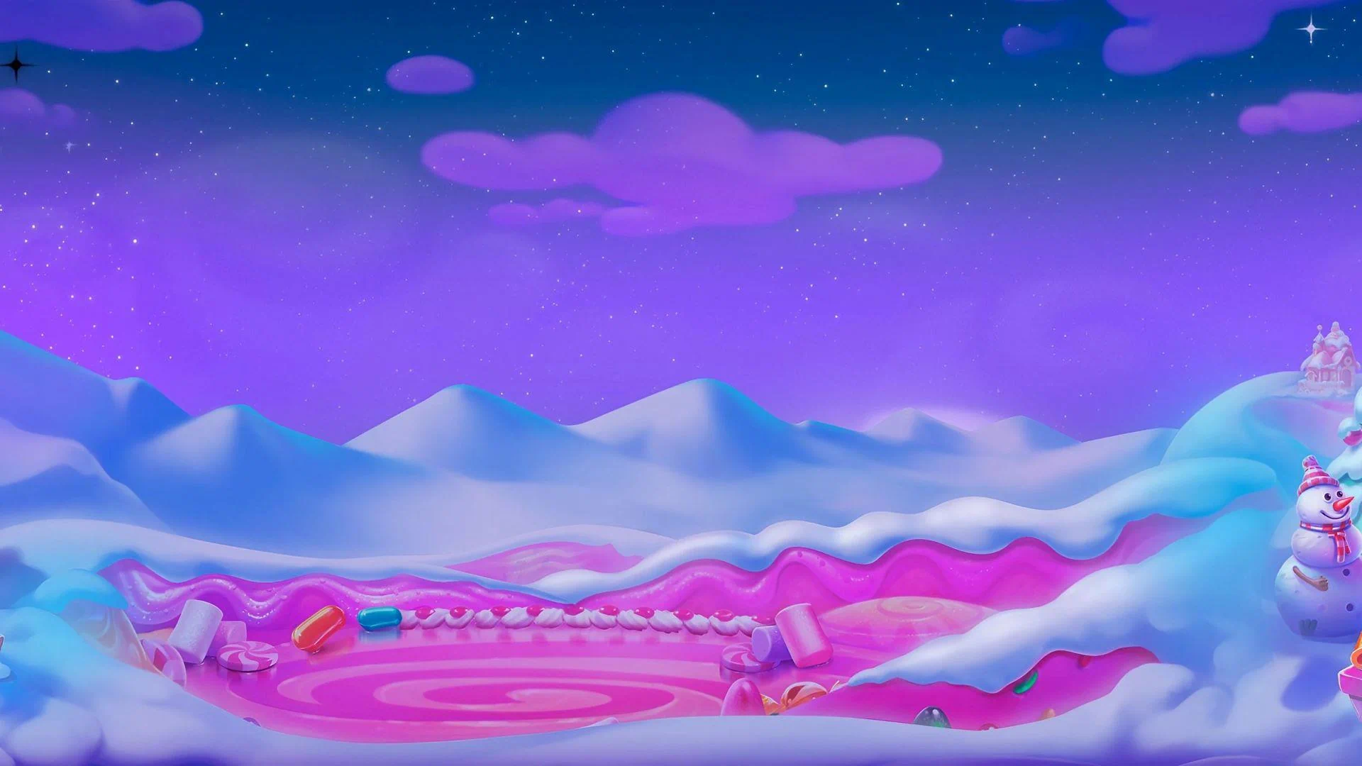 The visual presentation transforms the traditional candy world into a festive paradise, with snow-covered treats and holiday sparkles adorning the reels.